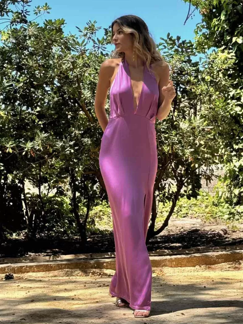 Robe longue pour invitée fabriquée en tissu de viscose satinée qui la rend encore plus élégante. Avec un décolleté plongeant en V noué autour du cou et un dos nu. Fermée par une fermeture éclair invisible à l’arrière dans la zone de la jupe.