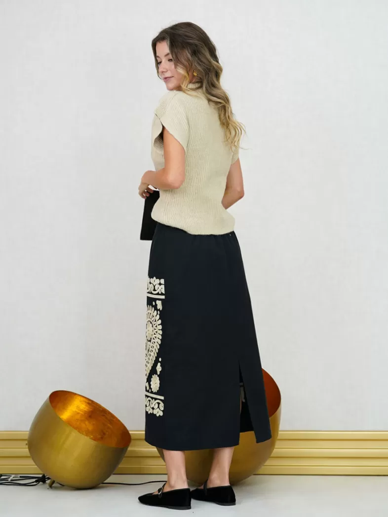 Notre Jupe Midi Bordada se distingue par la broderie à l’avant, qui apporte une touche bohème au design.